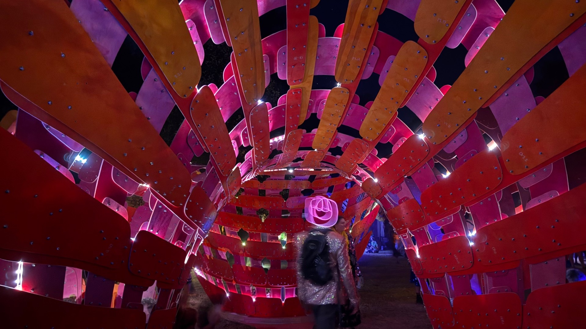 “Aurelian”, a collector of butterflies: a role that mirrors the whimsical nature of human connection at Fair. Aurelian harbors a lively environment where fair goers can seek respite from the sun, and wonder at dynamic patterns of light and shadow that filter through lattice work. The nighttime experience: multi-colored LEDs come to life, through immersion to visually captivate viewers - as flowers allure pollinators to their colorful displays.