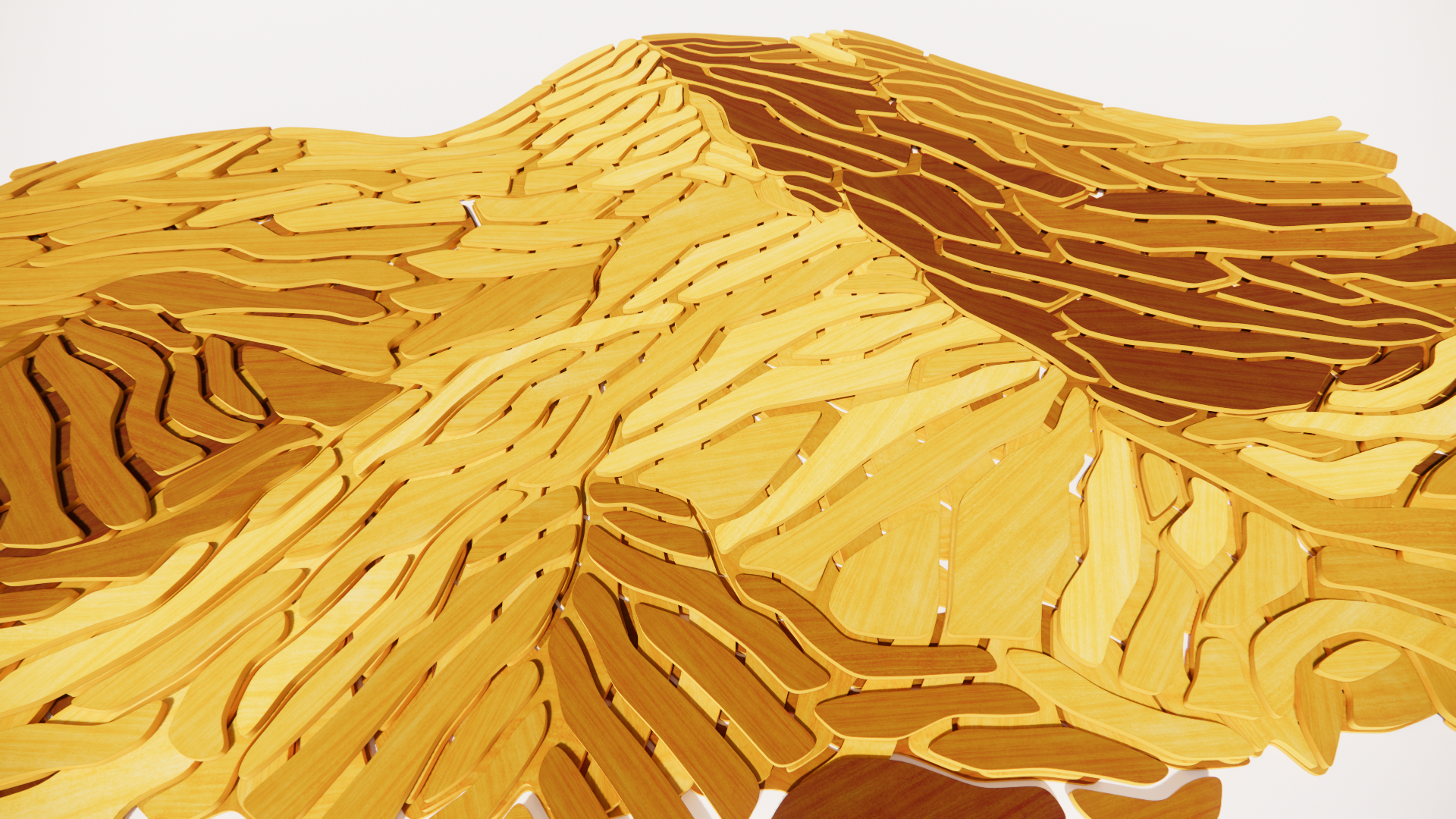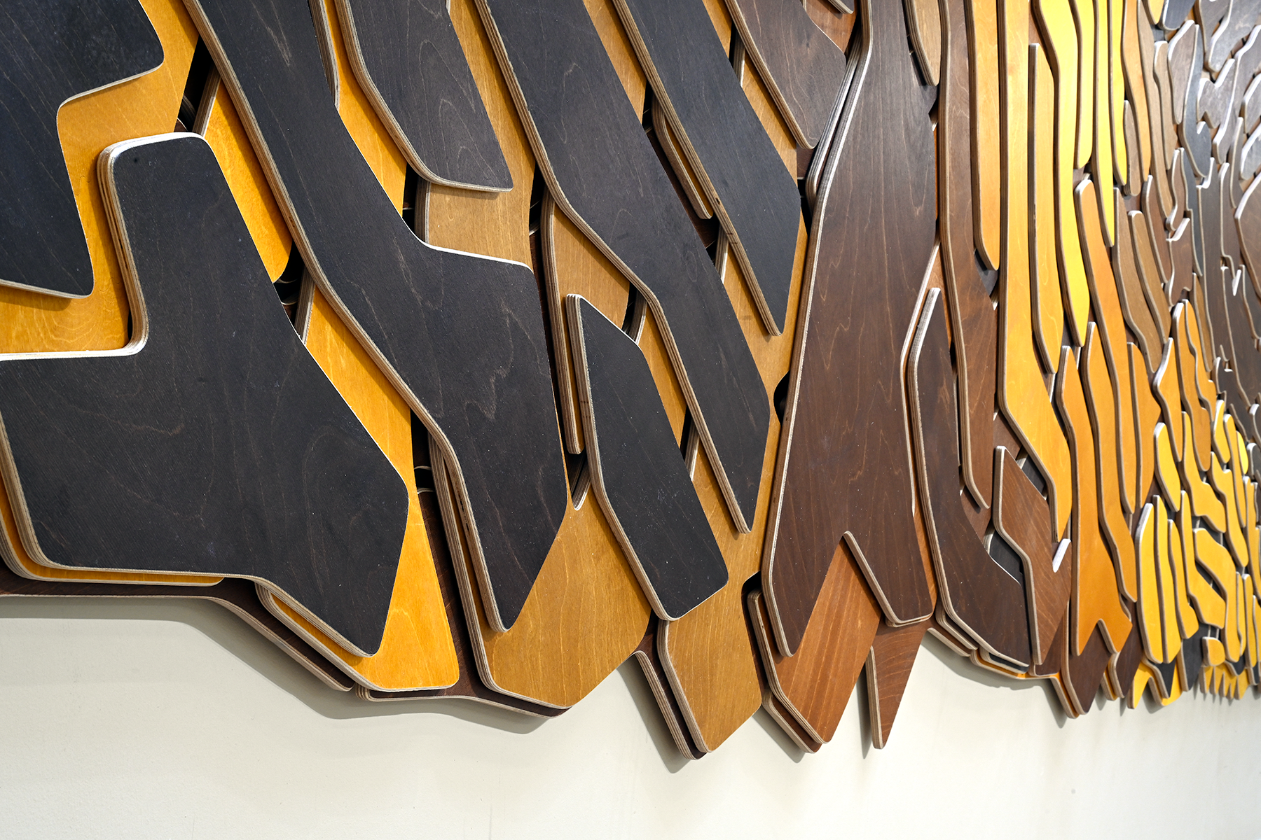 Inspiration for this mural comes from the incredible landscape and colorful skies ever present throughout Wyoming. Converting the idea of woven lassos to create Wyoming’s timeless beauty. Wood is chosen as the aesthetic both for durability and resonance with the natural environment. To envelope patrons in this environment, the filigree will turn onto the upper walls and ceiling continuing the landscape and broad sky. At the edge the elements will fade away as their density is reduced.