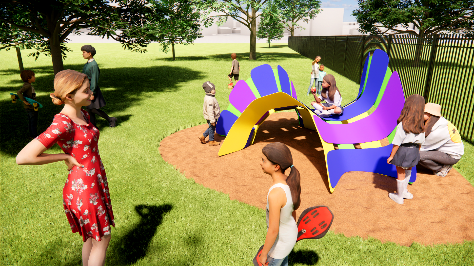 Amphisauria is a playful, prehistoric creature designed as a sculptural bridge between cultures. Inspired by the lilypad and the dinosaur, its form invites climbing, gathering, and imagination. The name blends amphi—meaning “both” or “across”—with sauria, nodding to ancient creatures. As children move over and around it, Amphisauria becomes a symbol of connection—linking traditions, generations, and stories through joyful play.